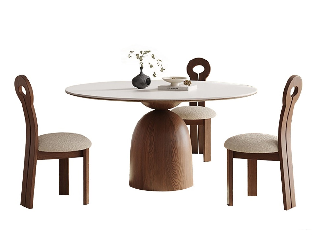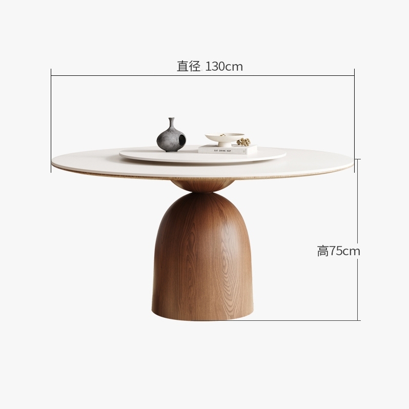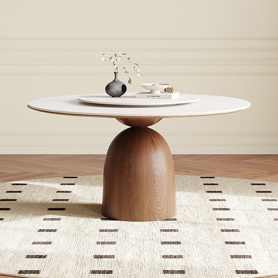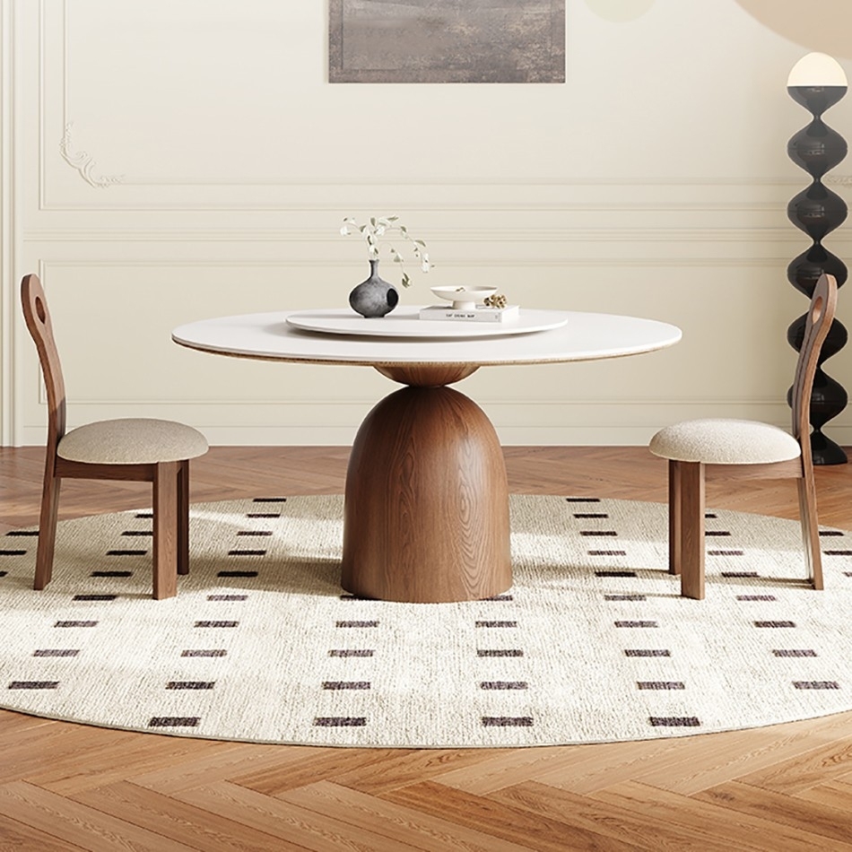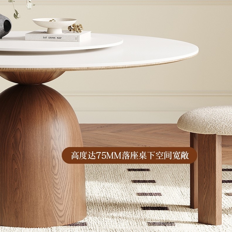中古风系列 小户型家用餐厅纯白哑光岩板带转盘圆形餐桌