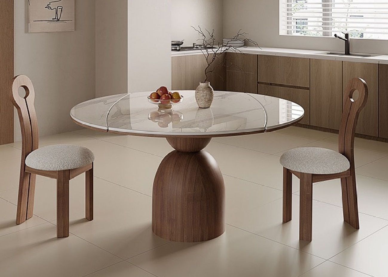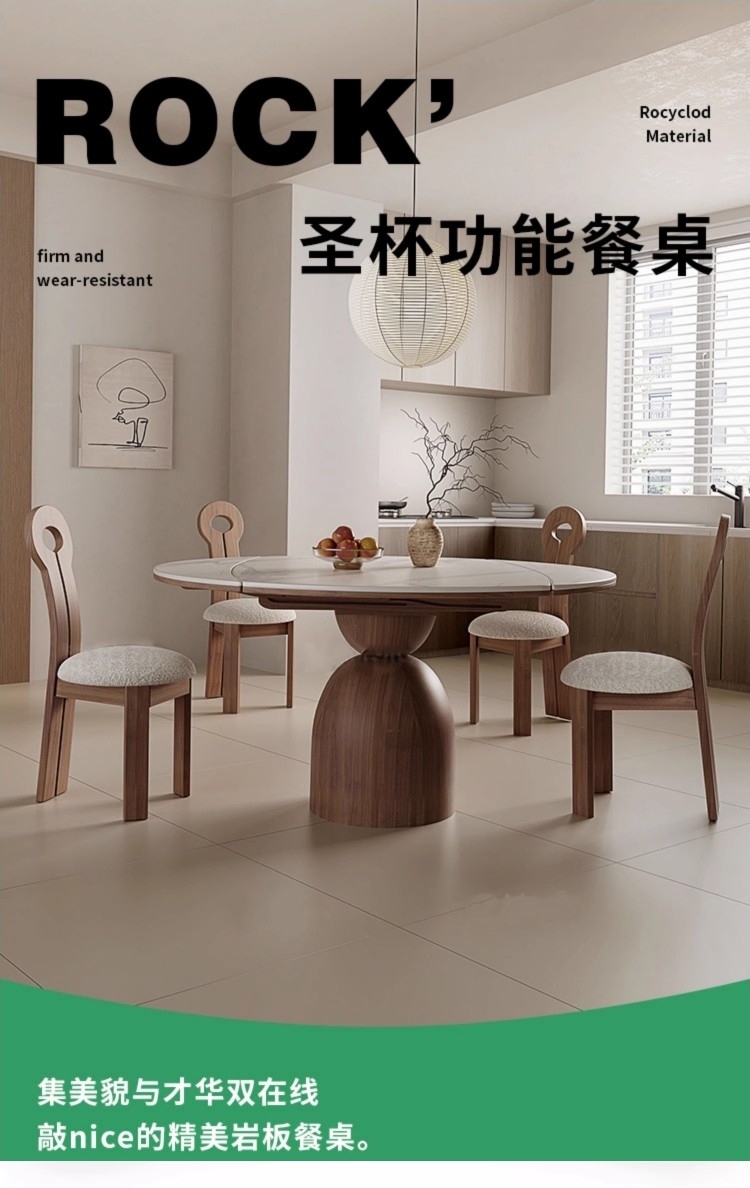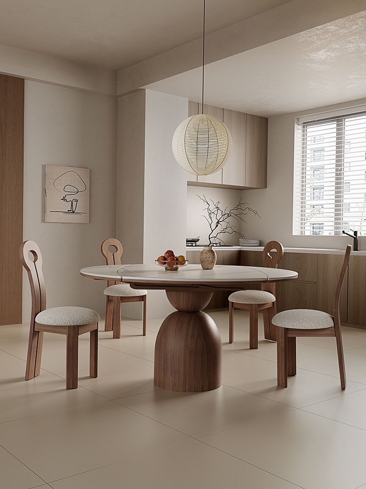 中古风家用小户型家用餐厅伸缩功能餐桌简约亮光鱼肚白岩板圆桌