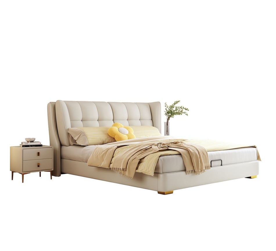 产品材质:框架:实木板+面料:猫抓皮+填充物:高密度海绵+10公分钢木排骨架+带床尾挡+5cm金属脚