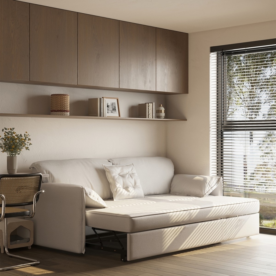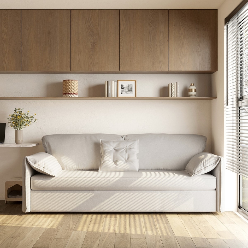 产品材质:框架:桉木、刨方内架+面料:磨砂布+填充物:高密度海绵+加厚五金功能件
