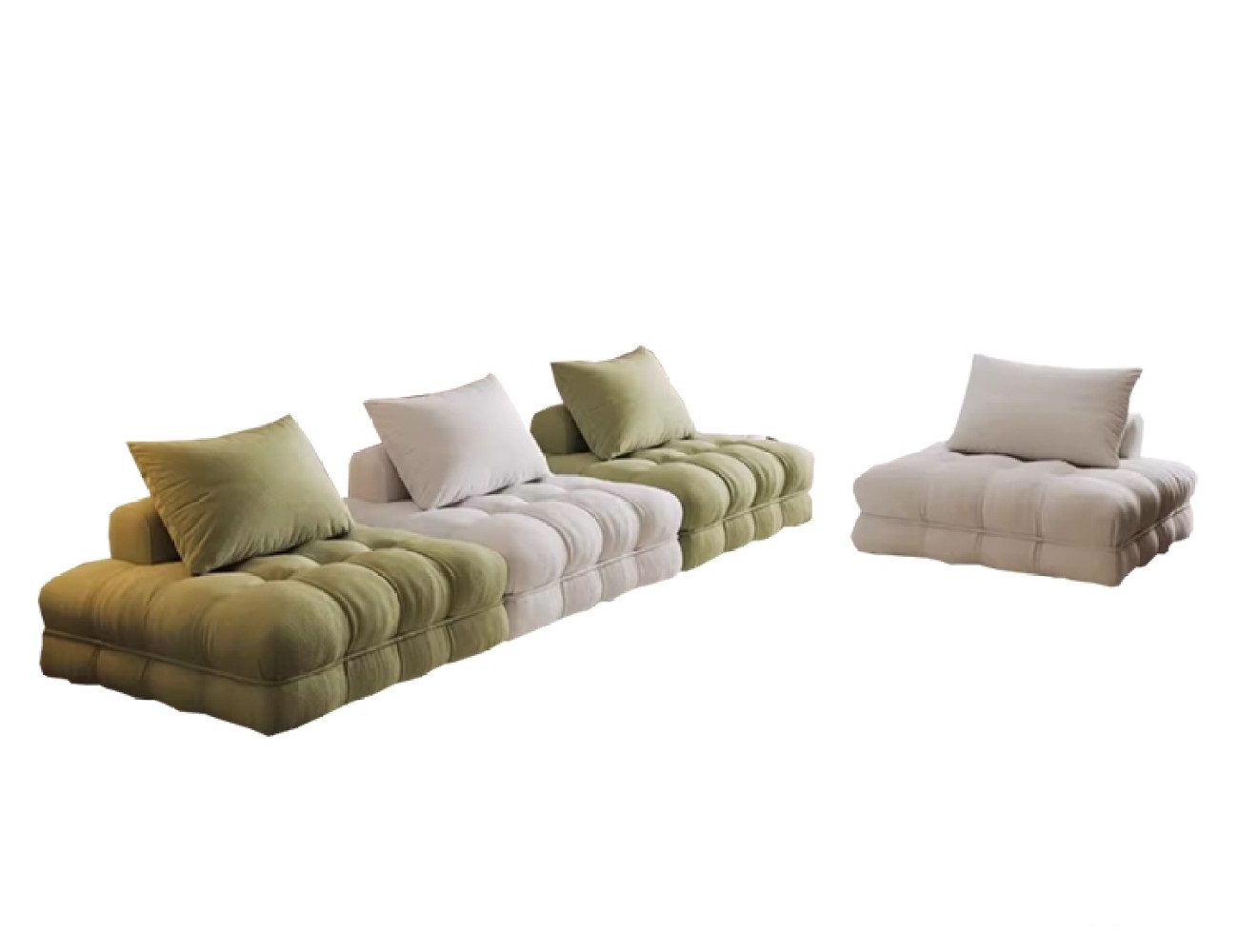 产品材质:框架:进口落叶松内架+面料:春蚕绒+填充物:乳胶、高密度海绵+靠包:公仔棉、羽绒+实木脚
