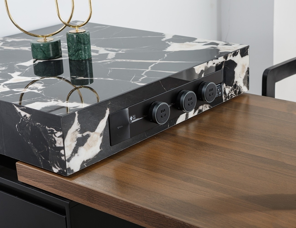 产品材质:柜体:实木多层板烤漆柜体+台面:(桌面)5cm吊边哑光木纹岩板、(岛台/桌脚)全岩板下挂工艺+轨道插座