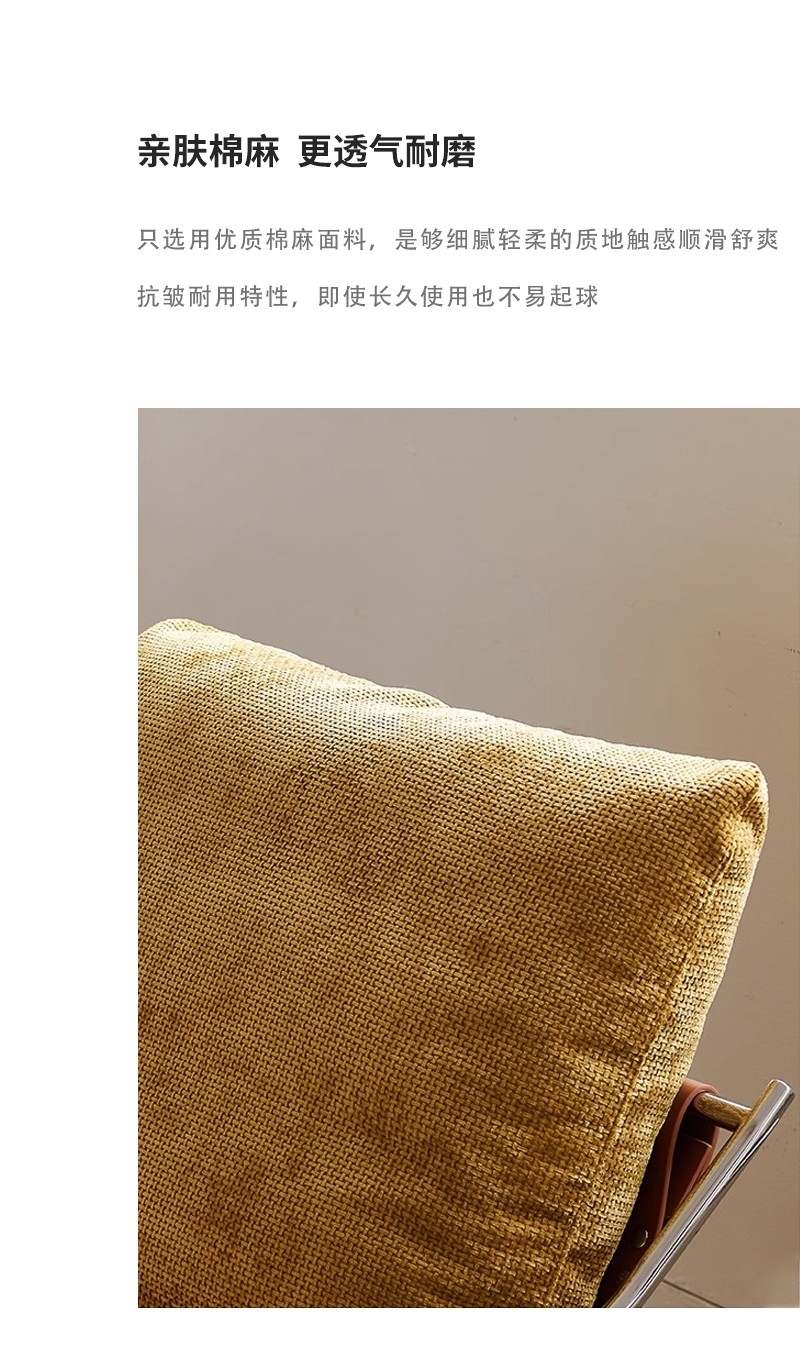 产品材质:框架:不锈钢铁架+面料:棉麻+填充物:高回弹海绵+实木底架