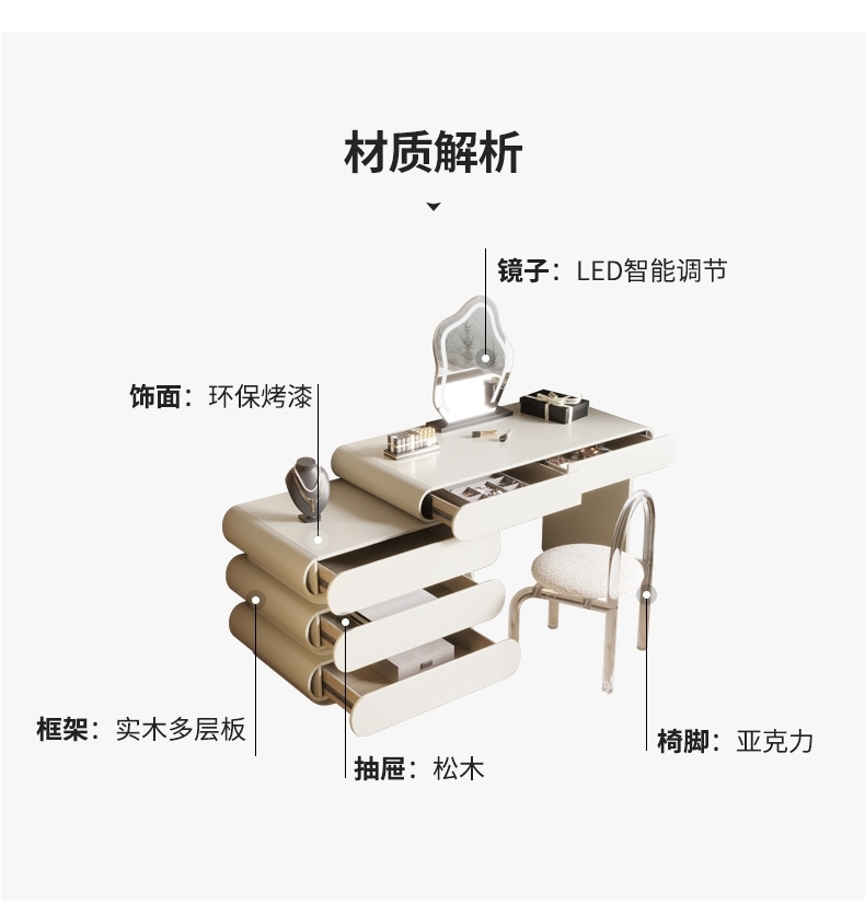 产品材质:框架:环保烤漆+全实在木多层内架+松木抽屉+LED镜子+亚克力椅子