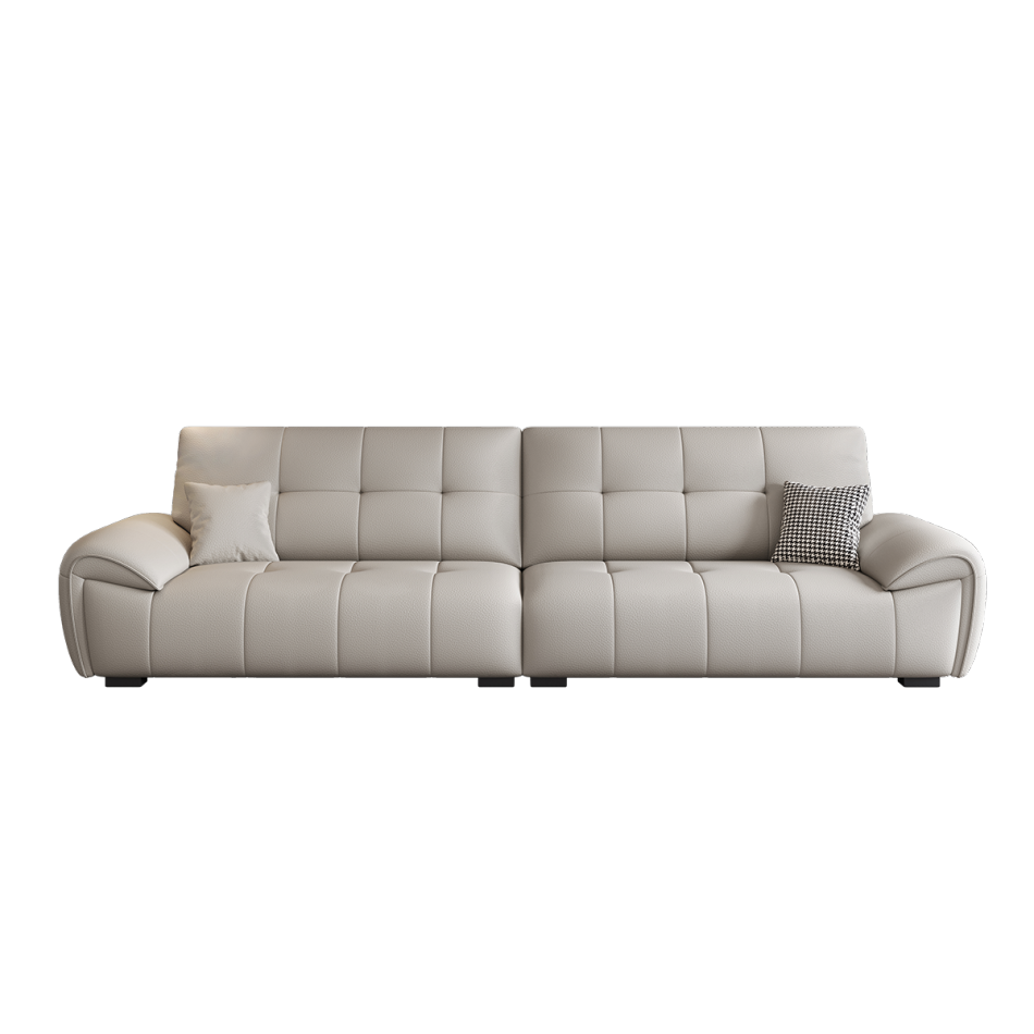 产品材质:框架:全进口落叶松框架+4.0锰钢弹簧+7厘橡筋绷带结构+面料:接触面生态真皮、非接触面仿皮+填充物:座包高密度回弹海绵,靠包羽绒,公仔绵+5cm黑钛塑钢脚