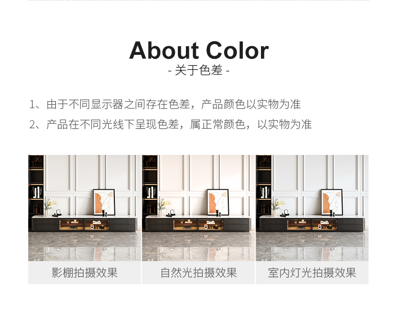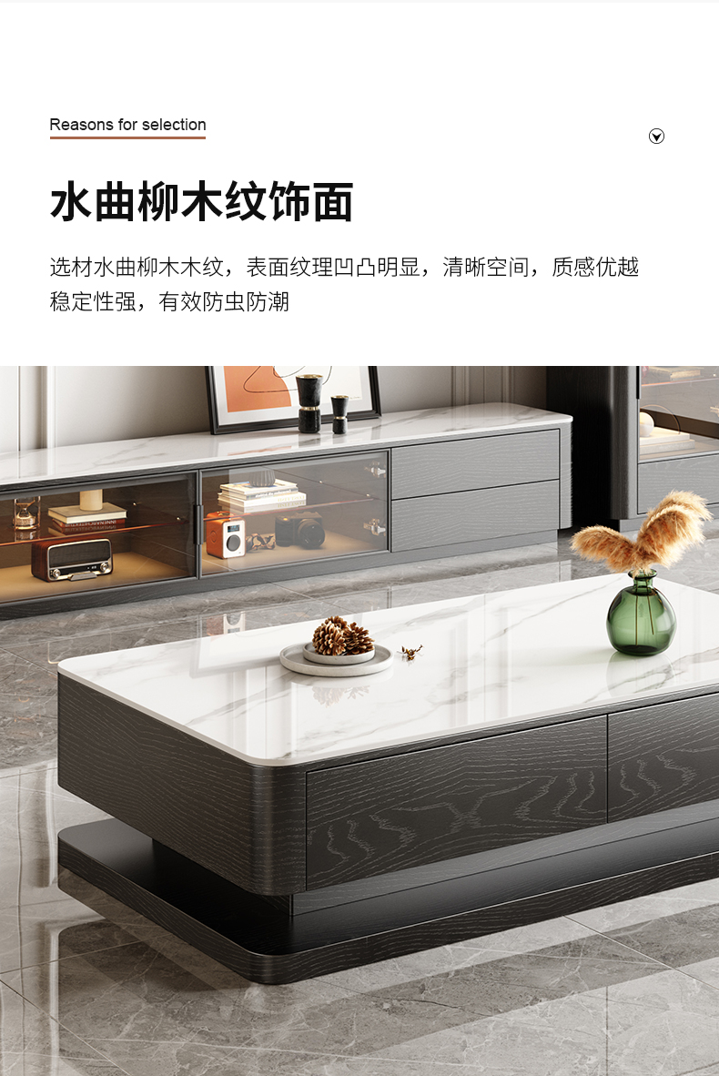 产品材质:框架:E1级板材贴黑色木皮+进口落叶松实木抽屉+台面:6mm亮光雪山白岩板+钢化玻璃门+智能感应LED灯+碳素钢黑砂五金架