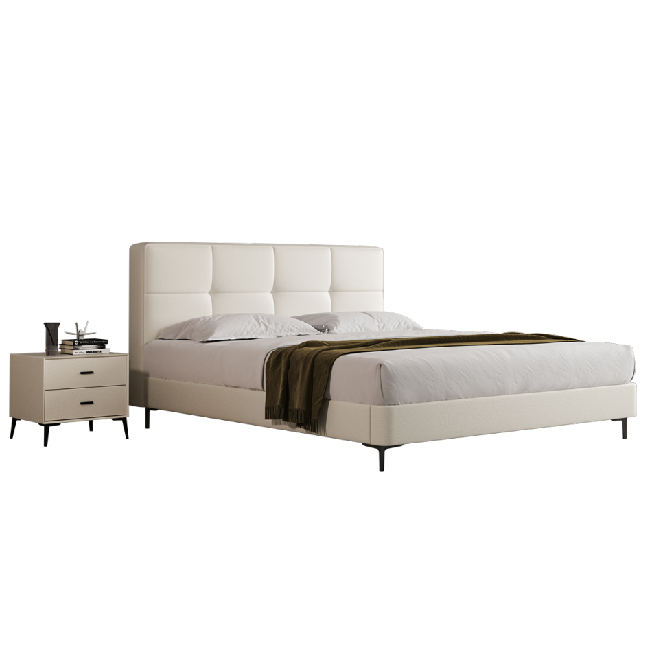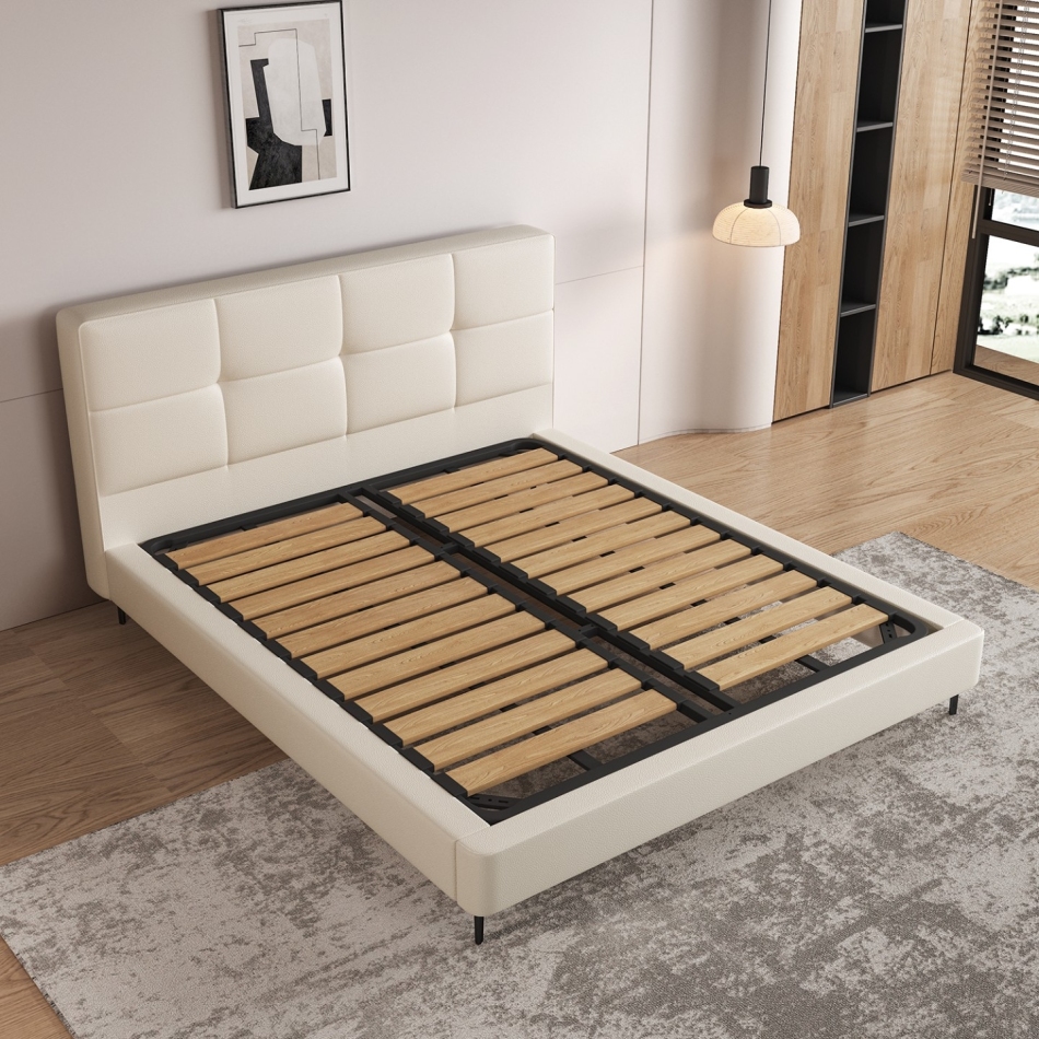 产品材质:框架:进口落叶松+多层实木板+10分钢木排骨架+面料:接触面头层牛皮、非接触面仿皮+填充物:高密度海绵+带床尾挡+12cm碳素钢脚