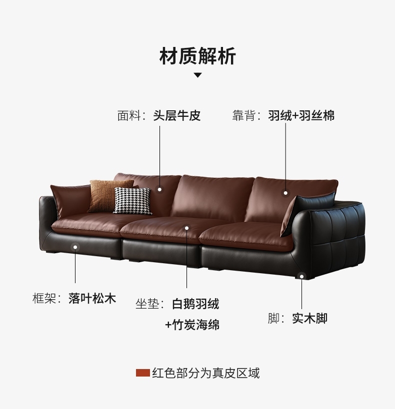 产品材质:框架:落叶松木内架+面料:接触面头层牛皮,非接触面仿皮+填充物:(座包)白鹅羽绒、竹炭海绵(靠背)羽绒、羽丝棉+实木脚