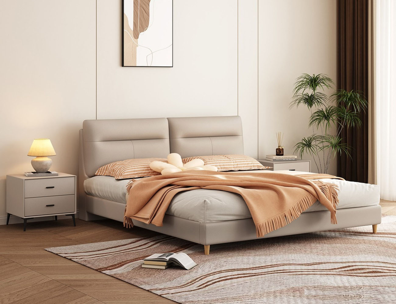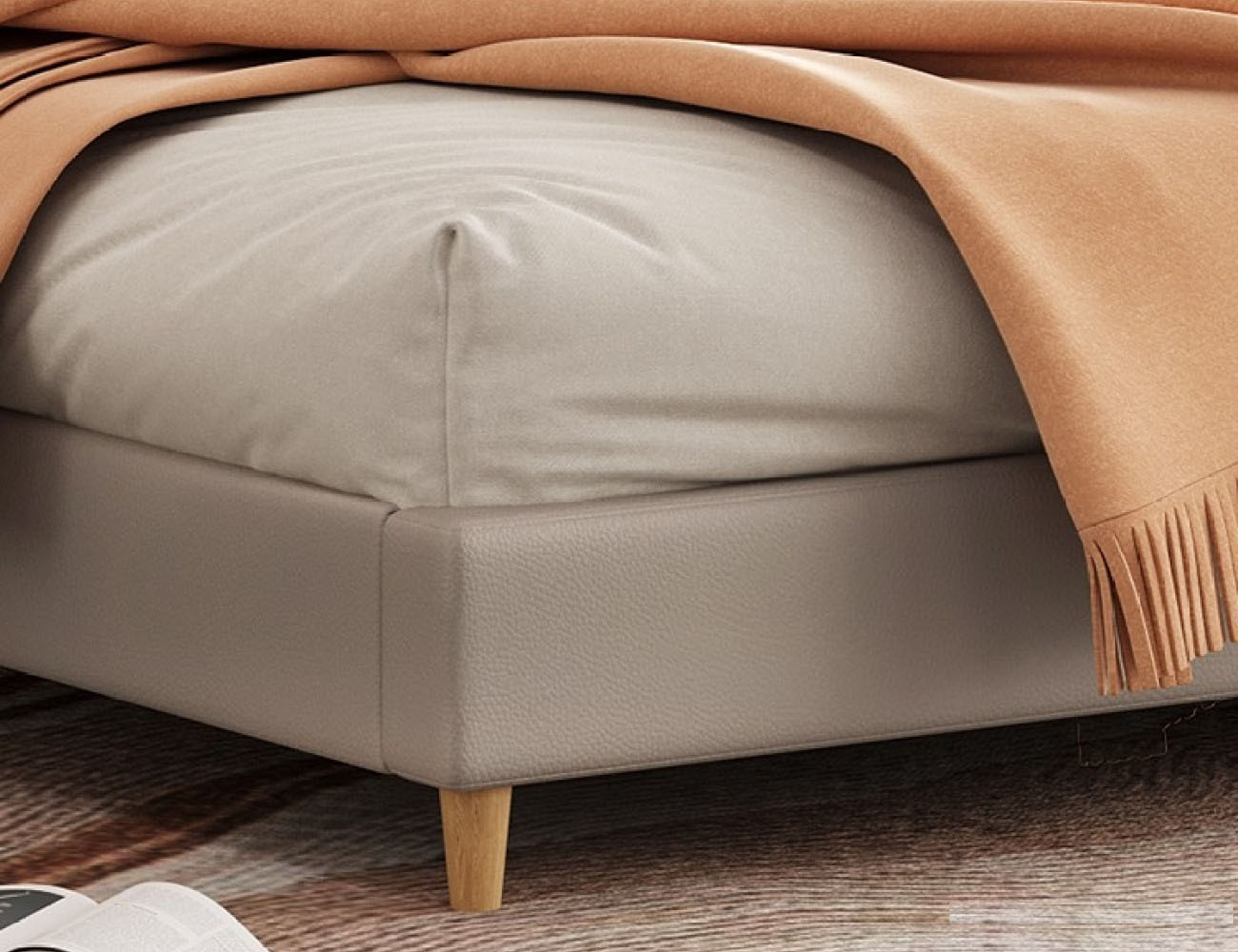产品材质:框架:进口落叶松+多层实木板+10公分钢木排骨架+面料:接触面生态真皮,非接触面仿皮+填充物:无胶棉+带床尾挡+10cm木脚