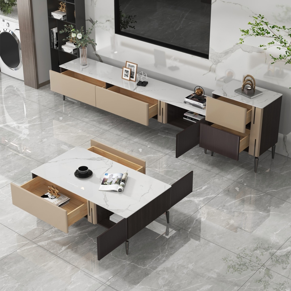 产品材质:框架:烤漆柜子+进口落叶松实木抽屉+台面:6mm亮光雪山石岩板+五金脚