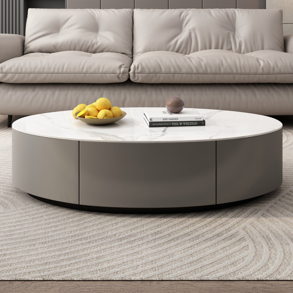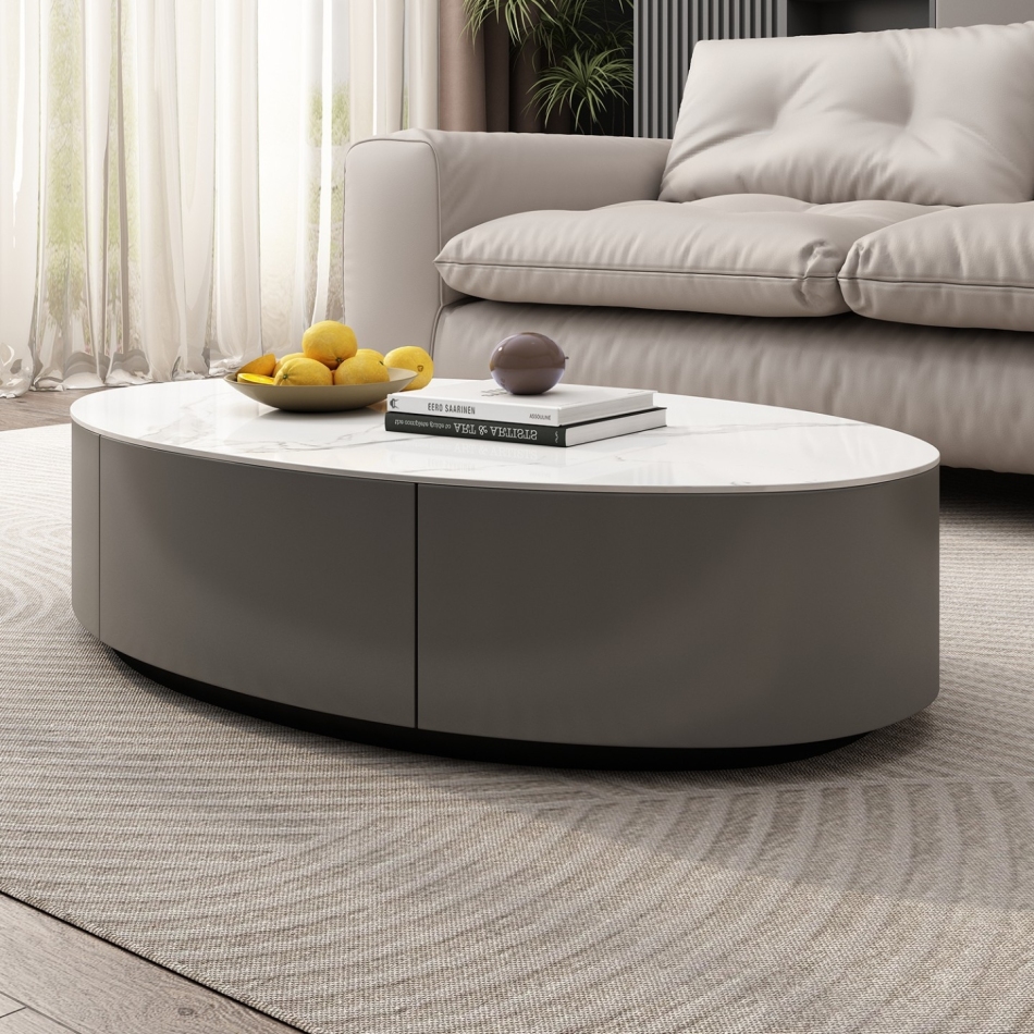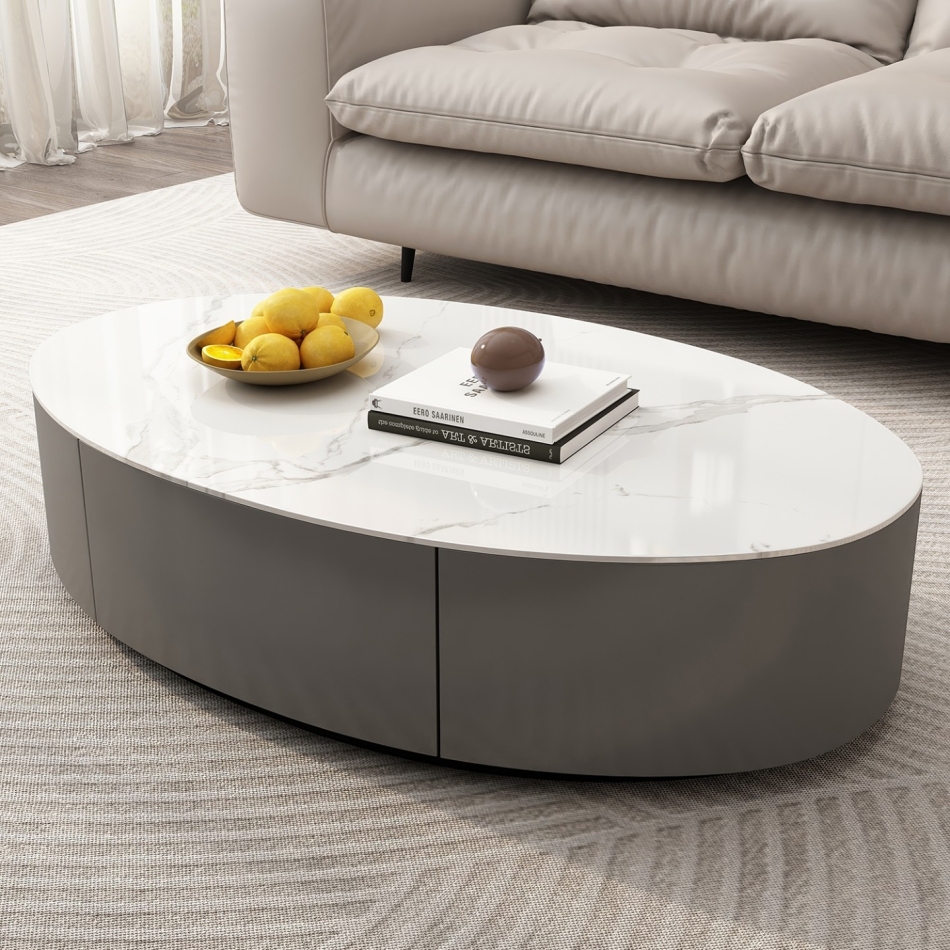极简雪山白亮光岩板茶几简约椭圆形收纳茶几