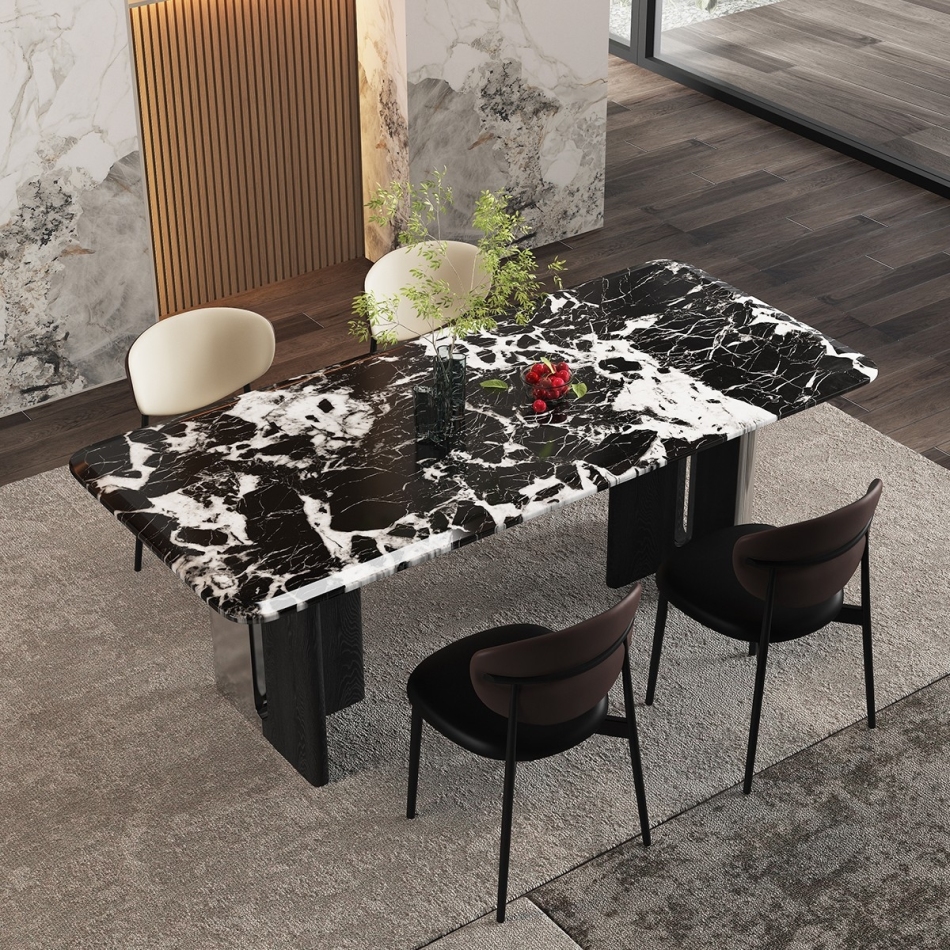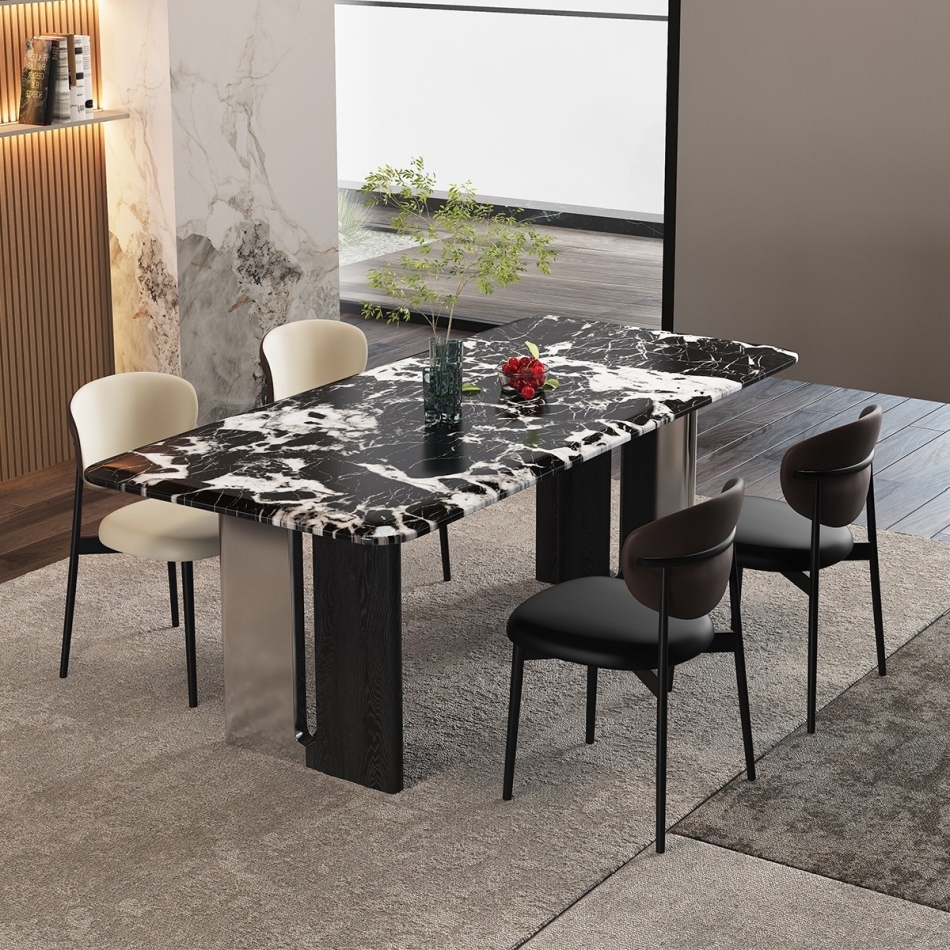 极简风家用镜面不锈钢白蜡木皮底架+人造大理石台面餐桌