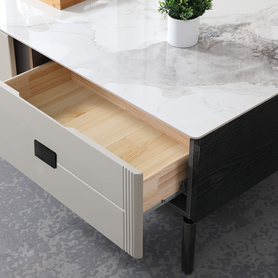 产品材质:框架:密度板+PVC环保覆膜工艺+抽屉实木+台面:6mm亮光香奈儿岩板+托底缓冲导轨+碳素钢脚