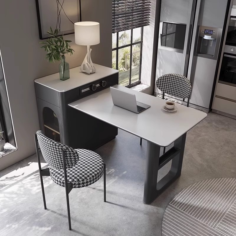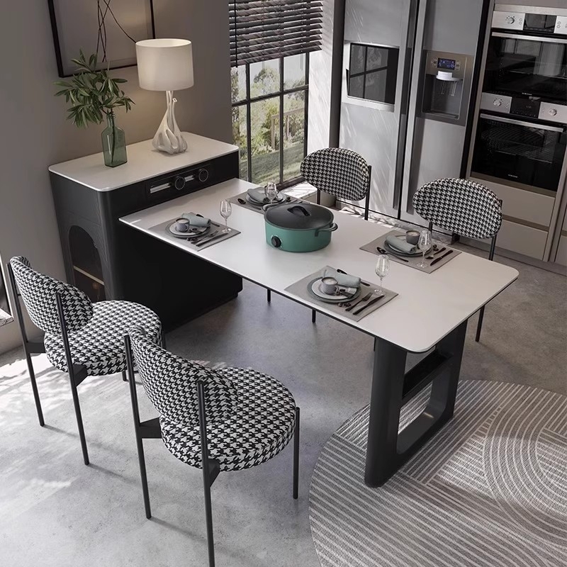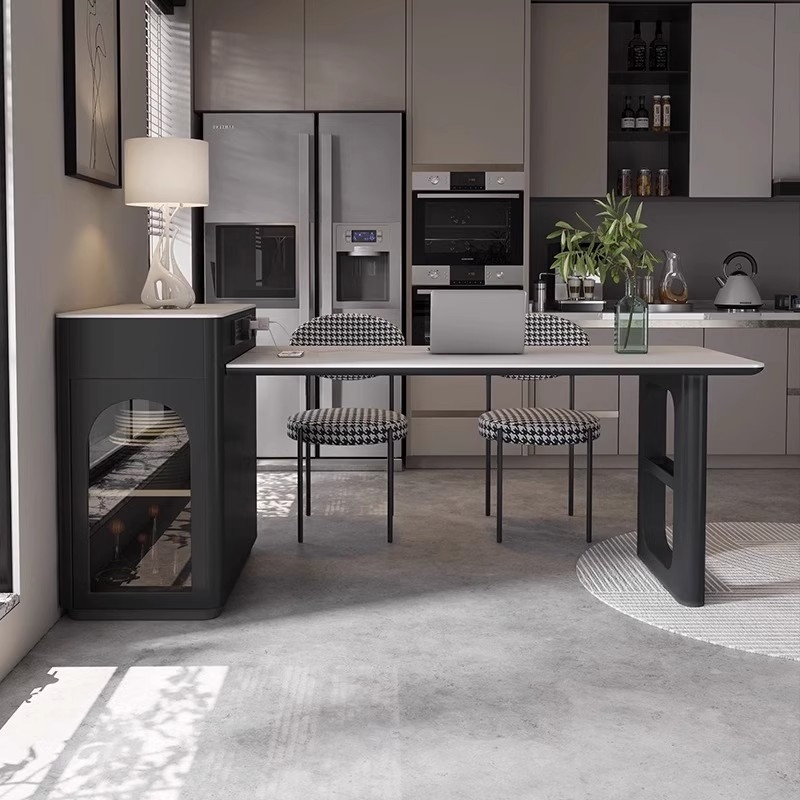 极简餐厅多功能餐桌客厅家用12mm哑光纯白岩板台面带充电插头多用岛台