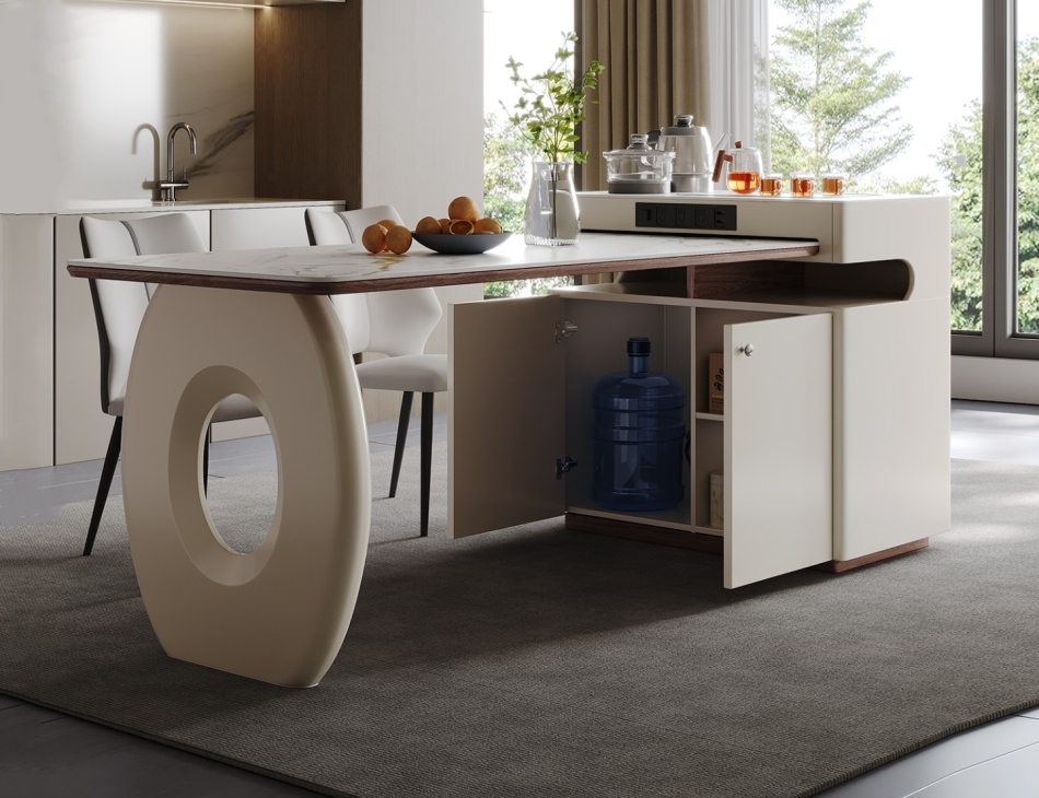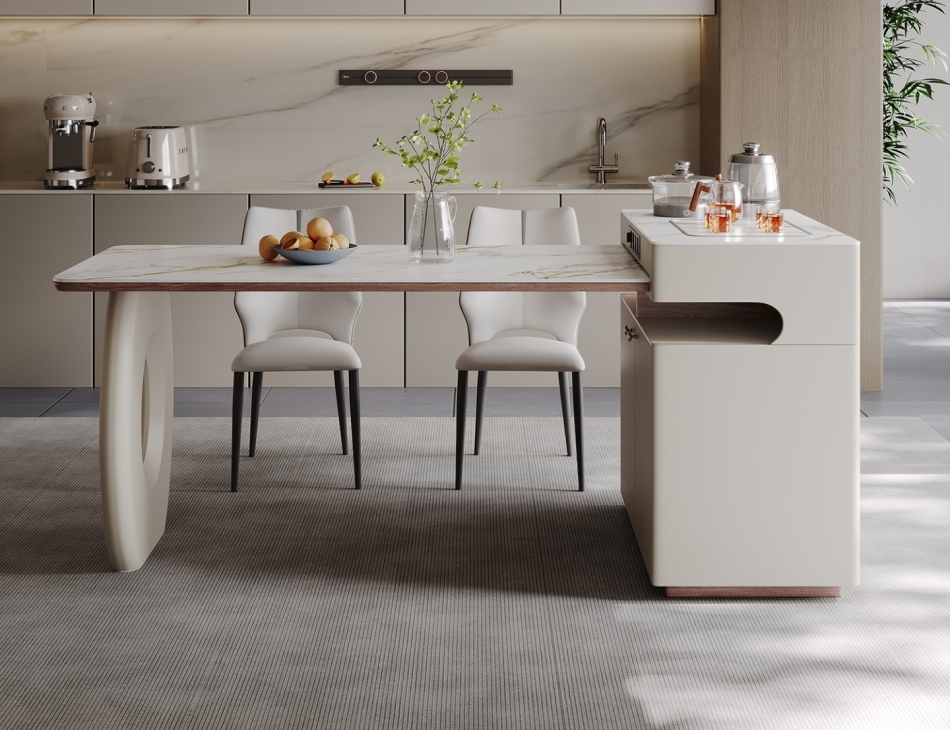 简约大气家用餐厅可伸缩带茶台岛台意式极简12mm亮光卡拉金岩板面餐桌岛台