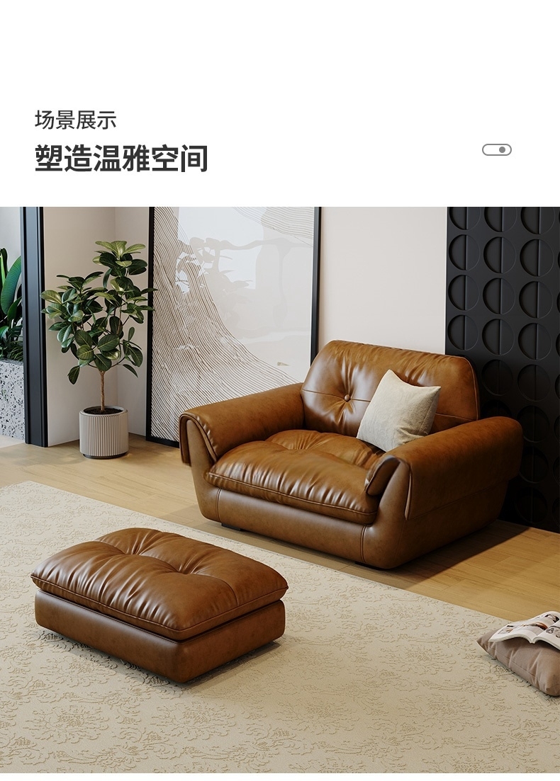 产品材质:框架:俄罗斯松木+面料:接触面生态亮光油蜡真皮、非接触面仿皮+填充物:(座包)上层高回弹海绵、下层高密度定型海绵(靠包)紫罗兰海绵+实木脚