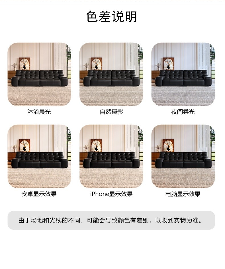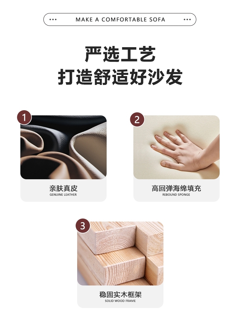 产品材质:框架:全俄罗斯松木内架+面料:接触面头层牛皮、非接触面仿皮+填充物:高密度海绵(靠包)公仔,羽绒+5cm脚