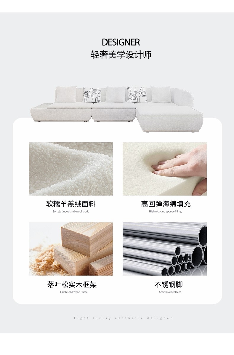 产品材质:框架:俄罗斯进口落叶松木+面料:羊羔绒+填充物:45高密度高回弹海绵+五金底架+5cm圆脚+大理石