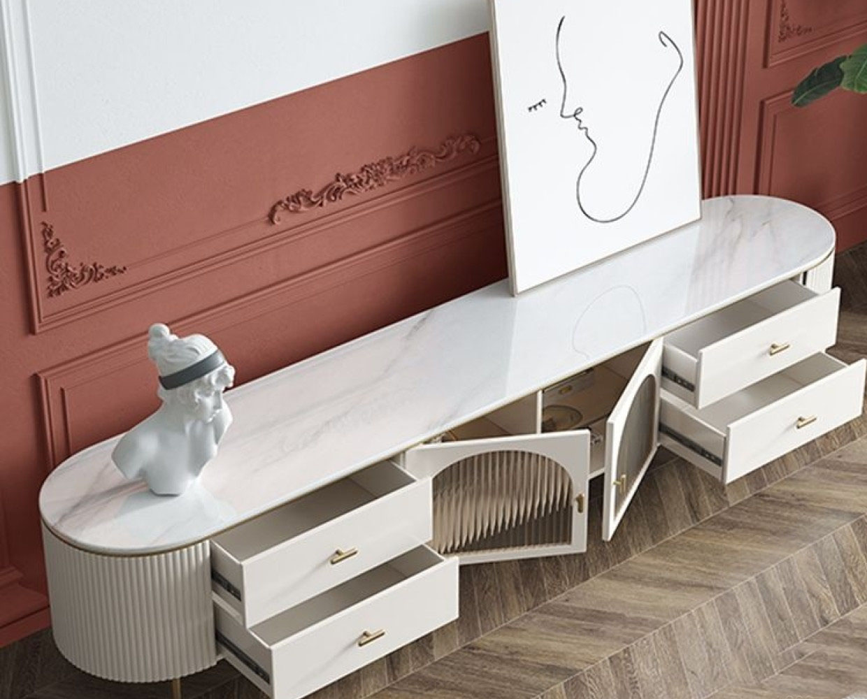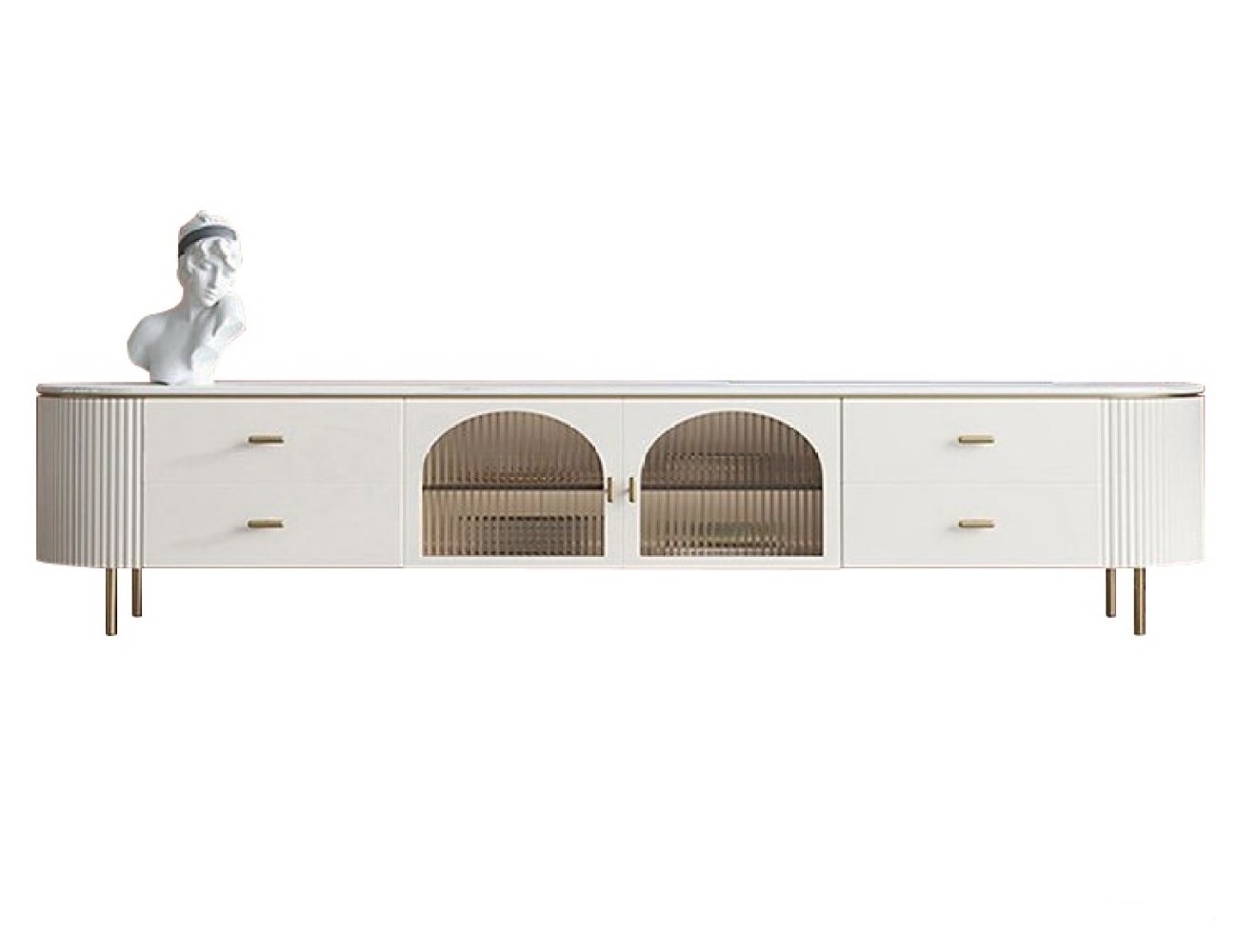 产品材质:框架:E1级板材烤漆+实木抽屉+6mm亮光雪山白岩板台面+铝合金玻璃门+不锈钢镀金五金脚