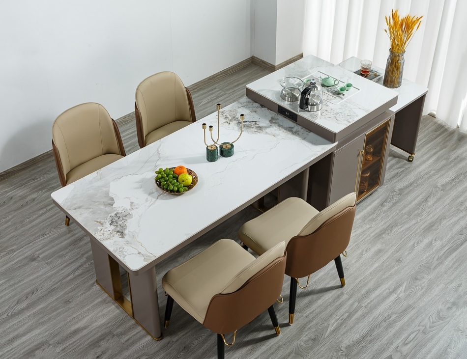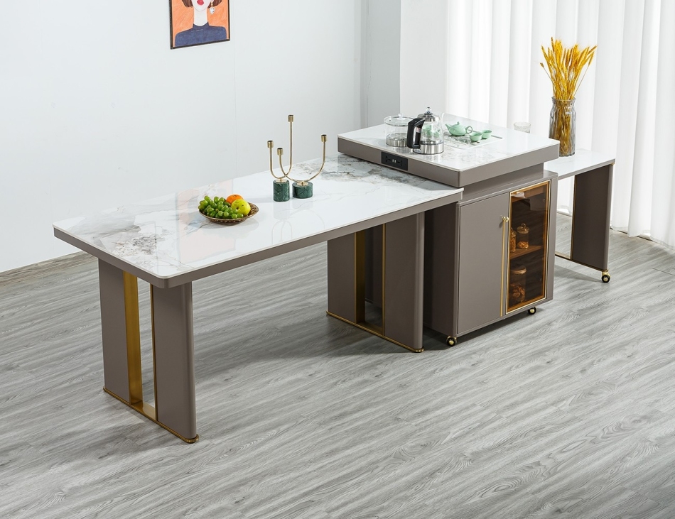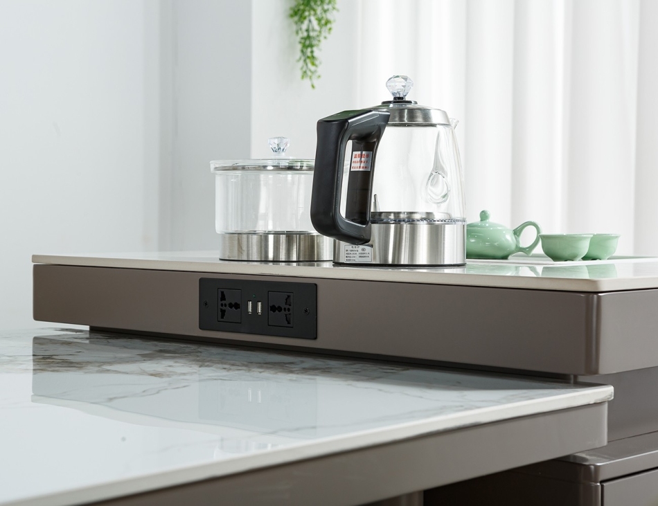 产品材质:柜体:E1级环保板材烤漆柜体+玻璃柜门+全托底板+台面:12mm亮光香奈儿岩板、(小桌板)6mm亮光香奈儿岩板+常规插座带USB充电+隐藏电磁炉+自动烧水壶+消毒锅+不锈钢五金底架