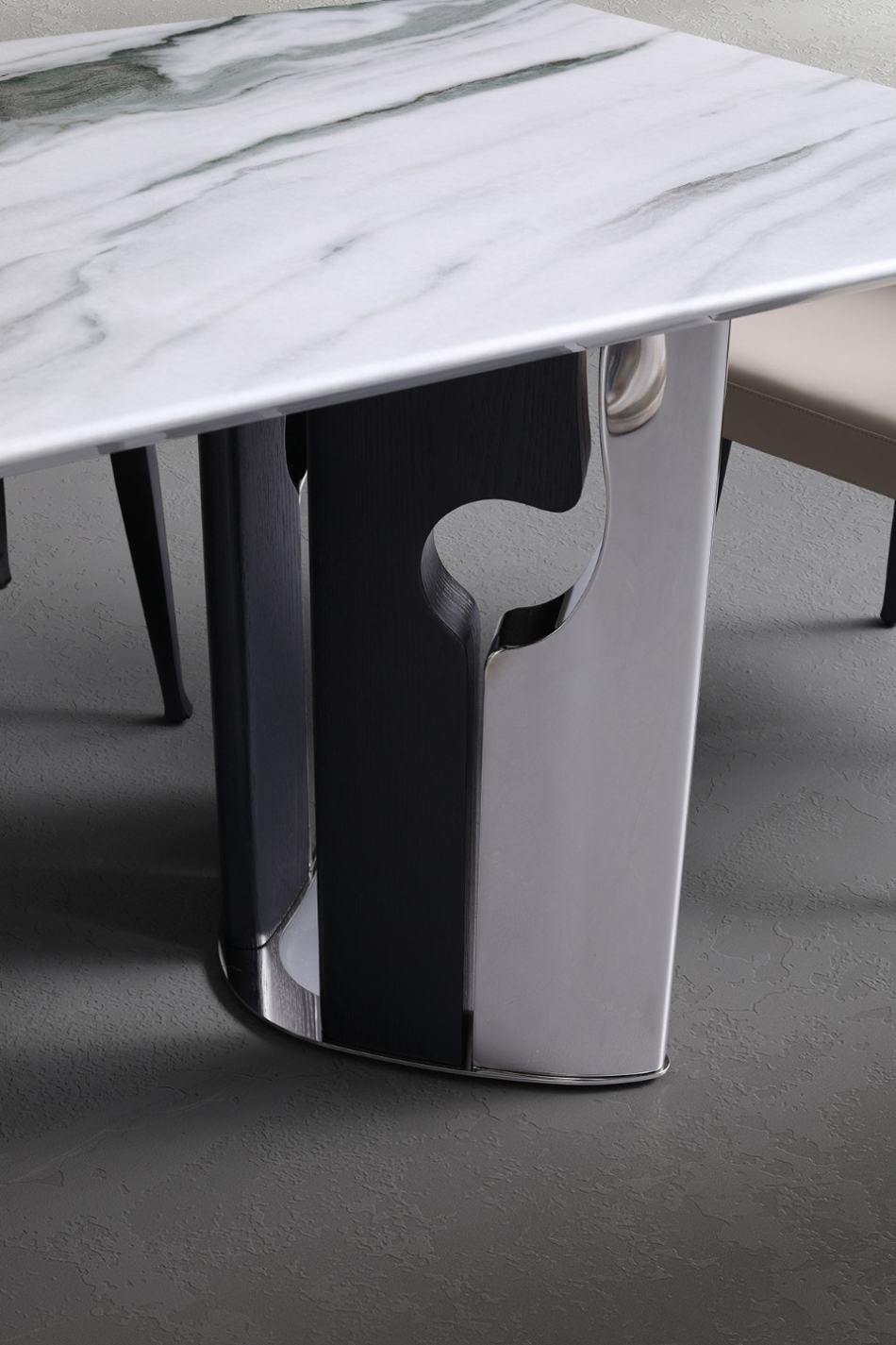 产品材质:框架:不锈钢镜面,实木贴水曲柳木皮工艺底架+全托全封实木底板+台面:烟影流香人造大理石