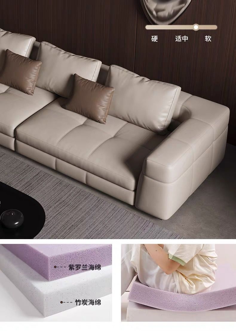 产品材质:框架:实木内架+面料:接触面头层牛皮、非接触面仿皮+填充物:(座包)紫罗兰海绵、竹炭海绵(靠背)羽绒、羽丝棉+实木脚